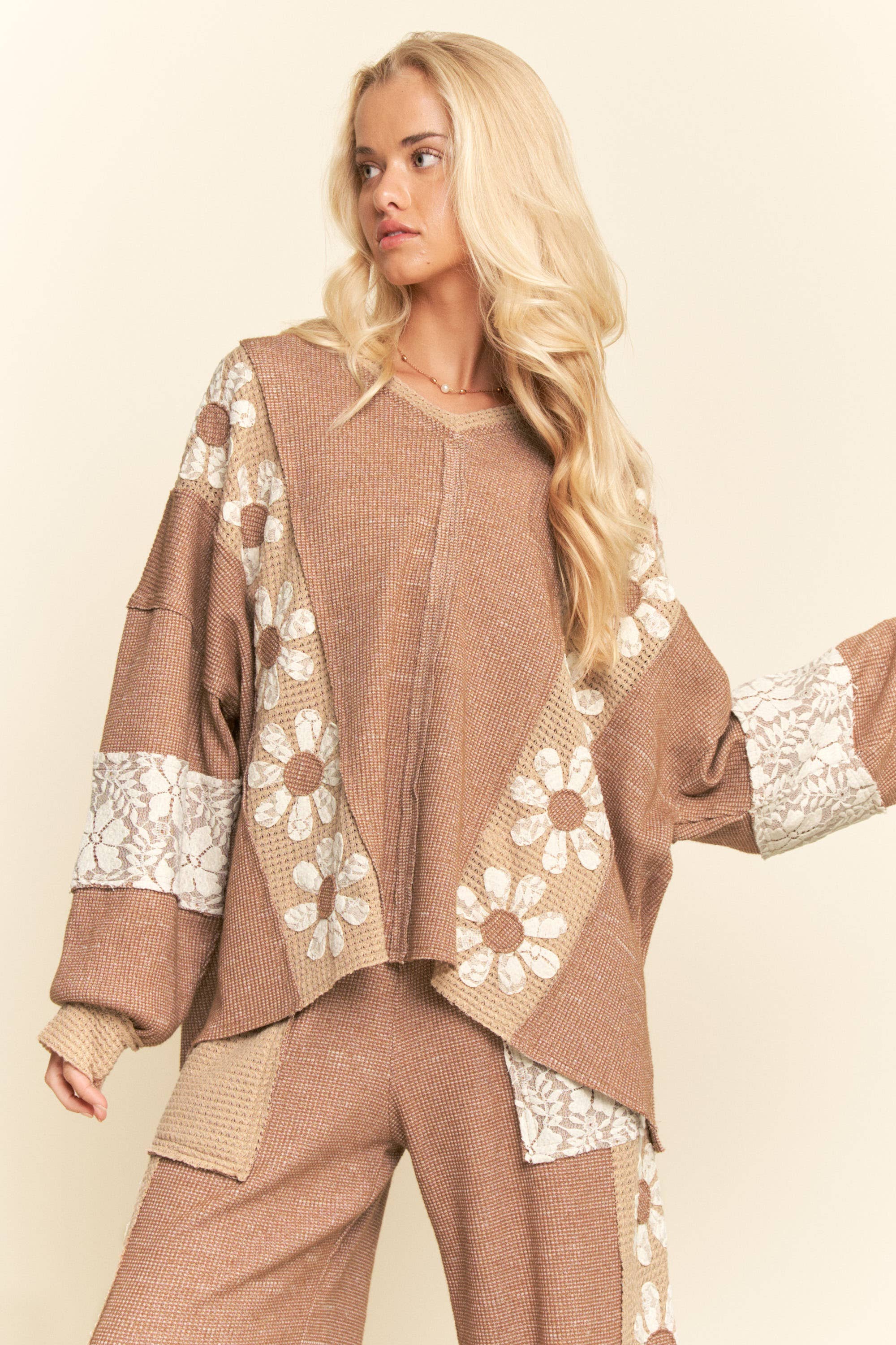 HEAVY WAFFLE KNIT LACE FLOWER SWEATSHIRT TOP 123