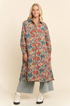 Elevate your layering game with this floral button-down coat. Featuring vibrant allover blooms, a relaxed silhouette, and side slits, this versatile piece works effortlessly as a lightweight coat or chic dress. Perfect for boutique buyers seeking statement outerwear with timeless appeal.