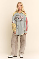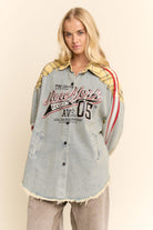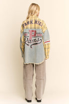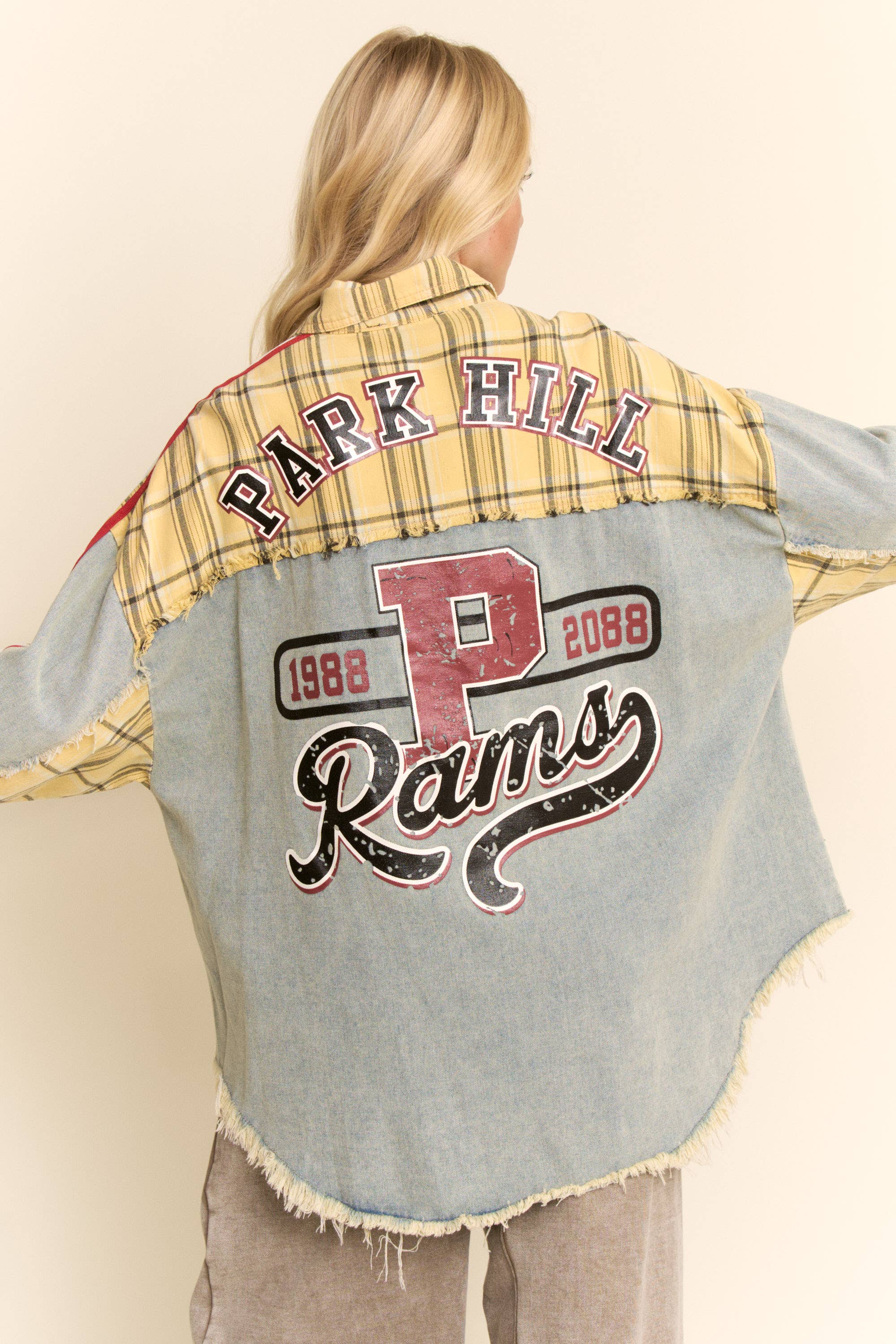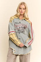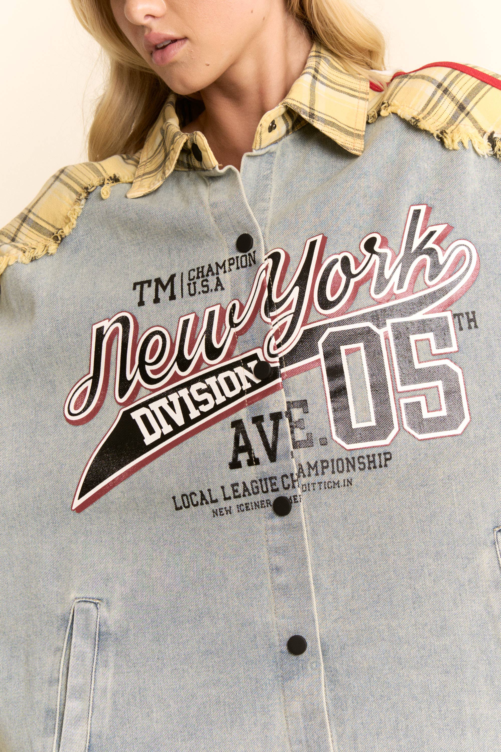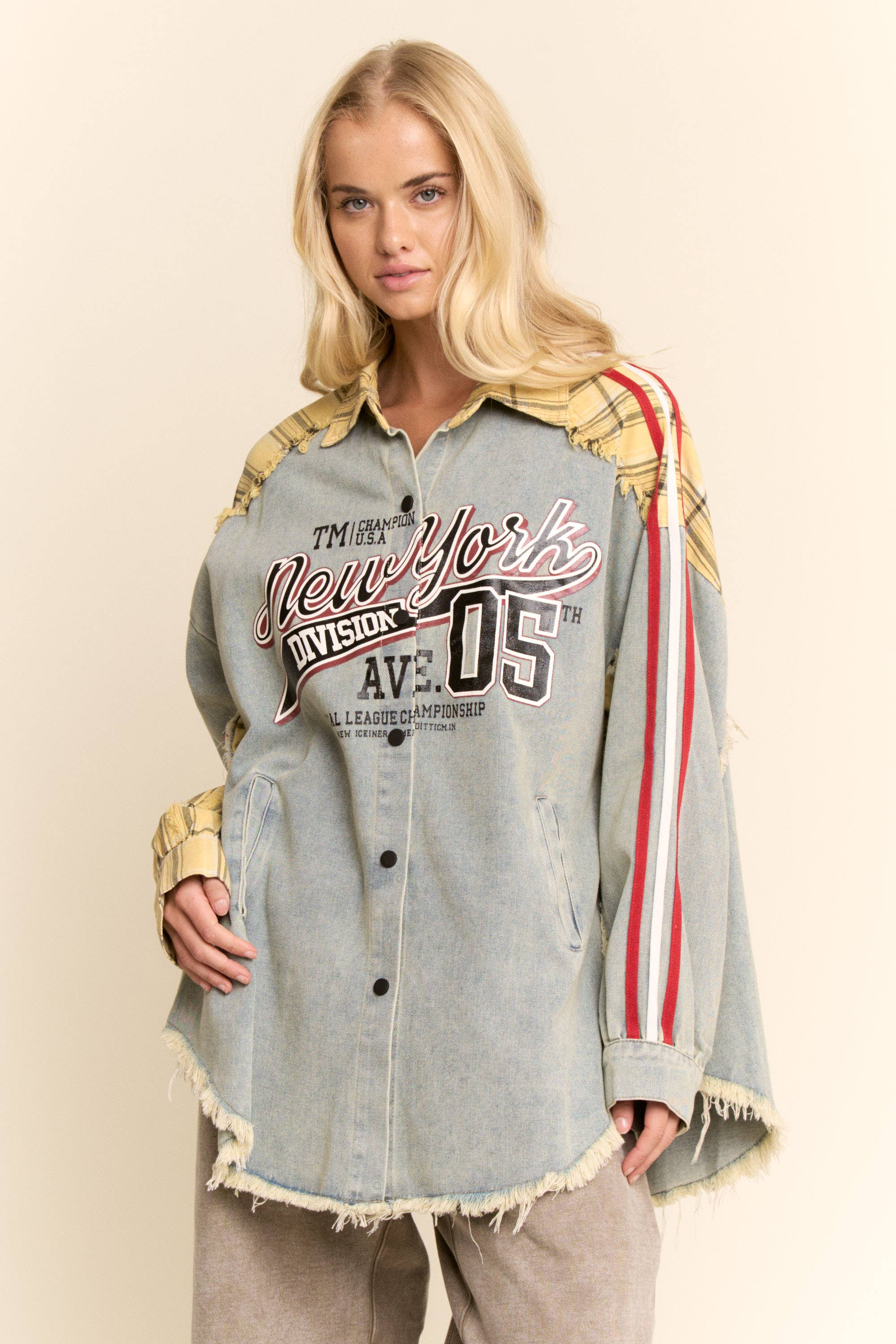 Standout denim patchwork shirt jacket blending varsity spirit with streetwear edge. Designed with contrast plaid sleeves, bold embroidery front and back, and athletic stripe detailing for a retro-sport look. Oversized silhouette layers easily over tees or knits, making it the perfect statement piece for boutique buyers seeking unique casualwear with character.