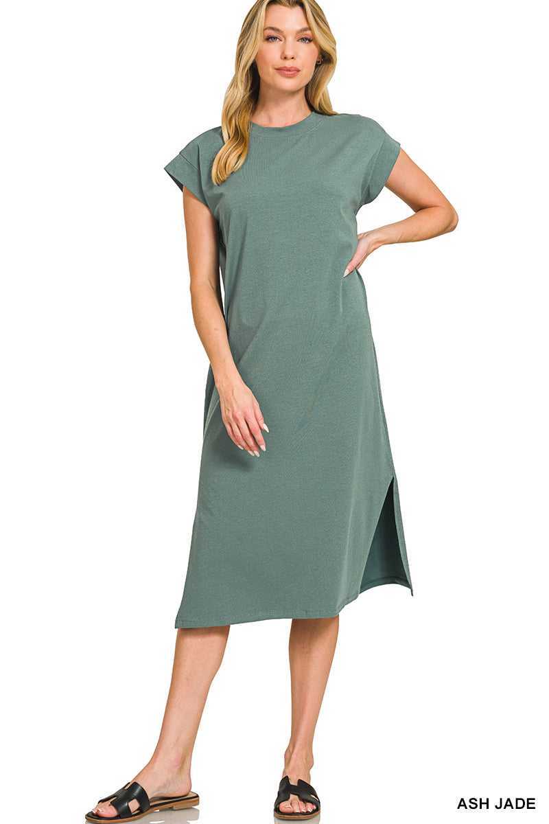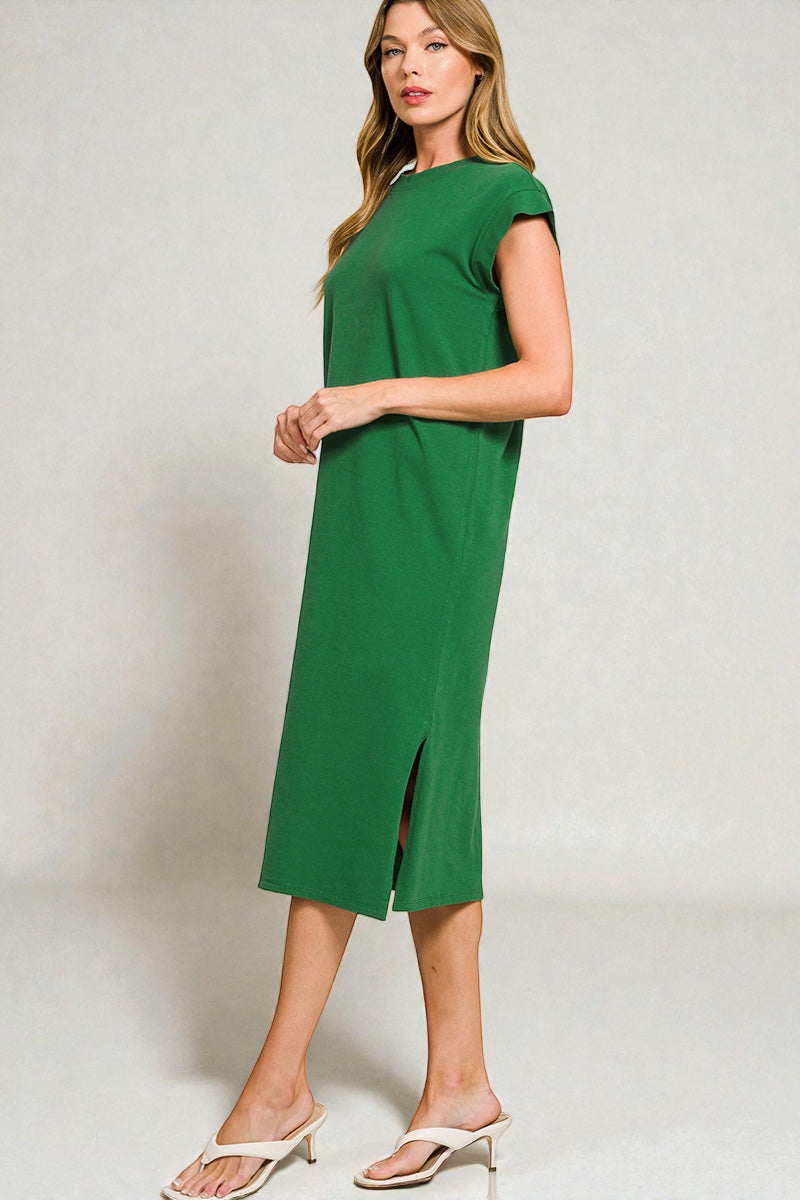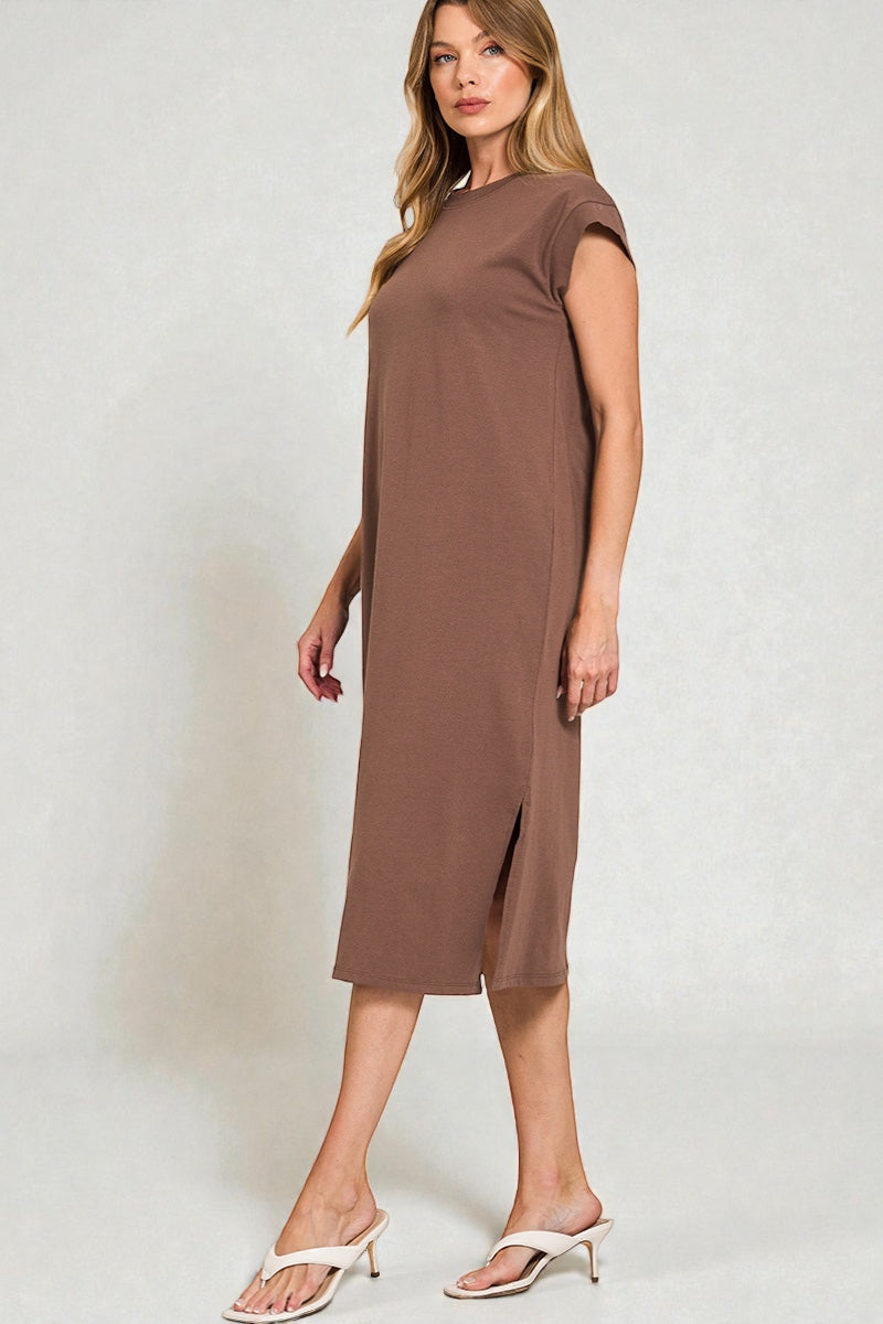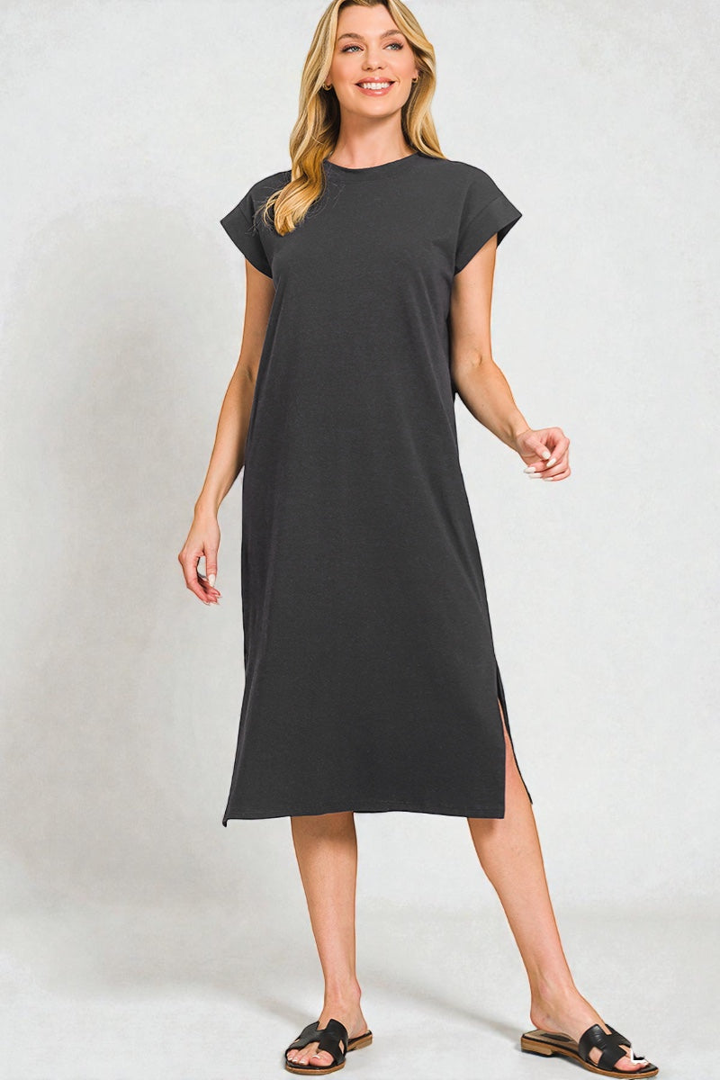A relaxed-fit midi dress designed for effortless everyday wear. Featuring a classic crew neckline, short sleeves, and a clean straight silhouette with a subtle side slit for ease of movement. Made from soft, comfortable fabric that’s perfect for casual outings, lounging, or easy styling from day to night.