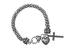 A stretchy beaded bracelet adorned with heart and cross charms, featuring textured metal accents and a comfortable, flexible fit. Perfect for everyday wear or meaningful gifting.