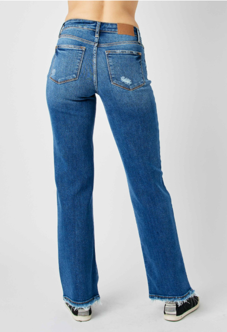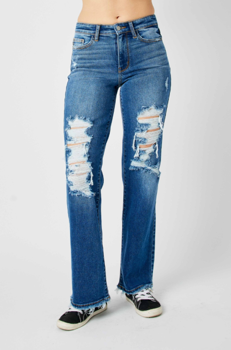 These high-rise denim pants feature a straight-leg silhouette with bold distressed detailing for a casual, street-inspired look. Built for comfort and everyday wear, the structured design maintains a flattering shape while allowing easy movement. A dependable wardrobe staple, this pair pairs effortlessly with relaxed or elevated styling for versatile day-to-day outfits.
