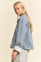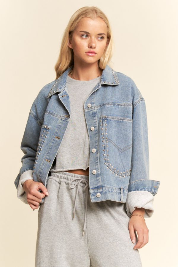 Elevate your outerwear lineup with this denim jacket featuring precision-placed studded detailing at the collar and pockets. The relaxed silhouette and polished hardware offer a boutique-ready piece that balances casual ease with standout edge-perfect for layering over knits, sets, or dresses year-round.