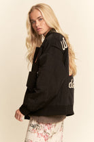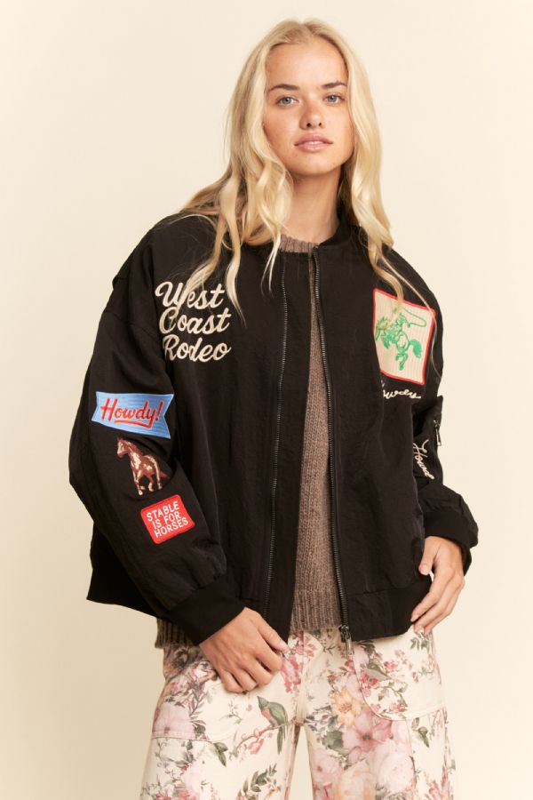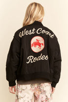 Western-inspired bomber jacket with bold cowboy embroidery and "West Coast Rodeo" lettering. Lightweight nylon shell with ribbed cuffs and hem, zip front, side pockets, and sleeve pocket. Available in Olive Green and Black. Perfect statement piece for boutiques, festival fashion, and streetwear collections.