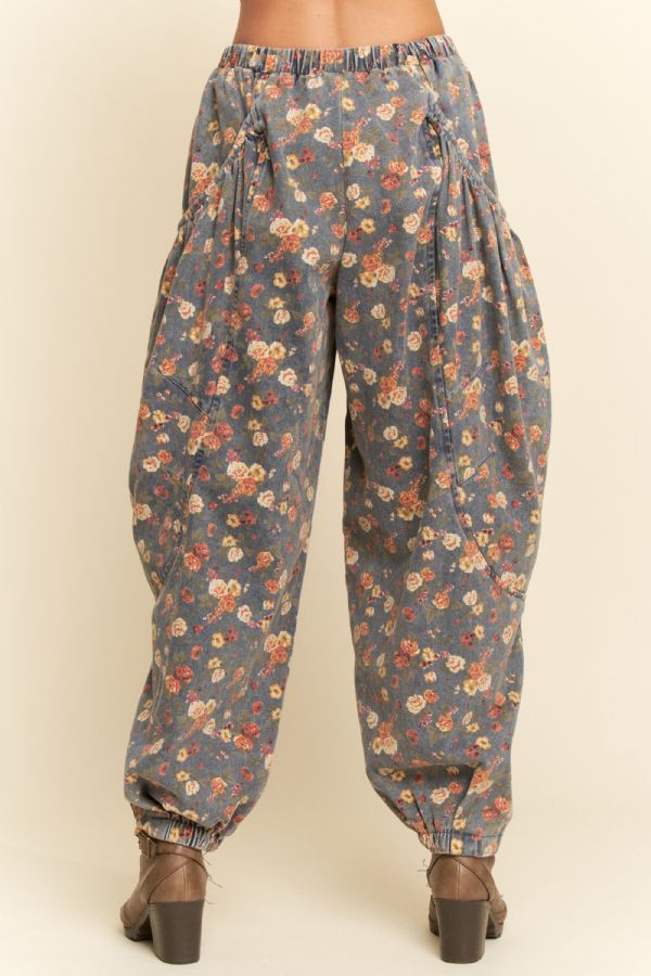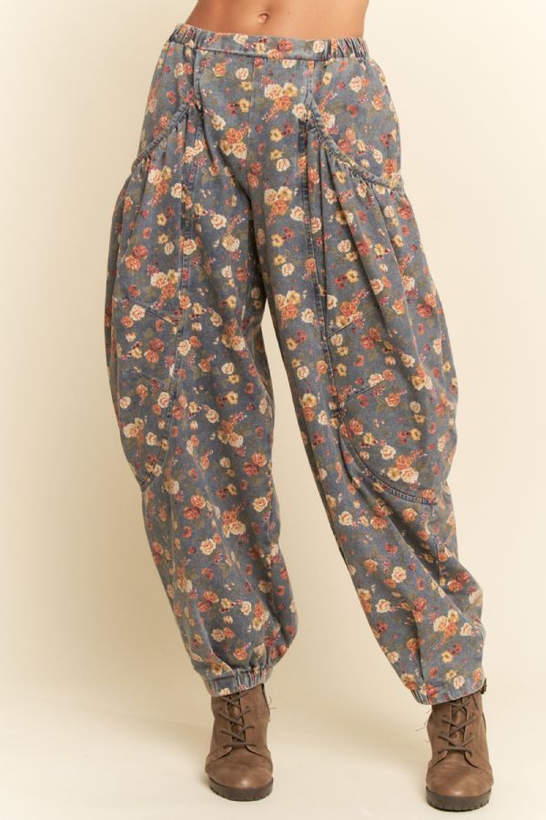 These floral denim jogger pants combine casual ease with vintage-inspired charm. Designed with gathered oversized pockets, elastic waist, and cuffed hems, they deliver comfort with standout detail. The soft denim base is scattered with allover floral prints, making them an eye-catching addition to boutique collections. Perfect for styling with sweaters, tees, or jackets, these joggers offer buyers a versatile piece that blends relaxed fit with feminine appeal.