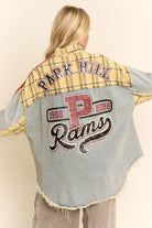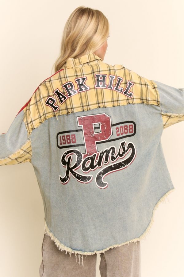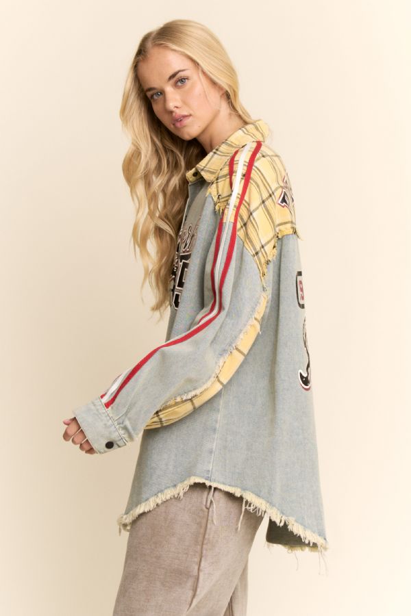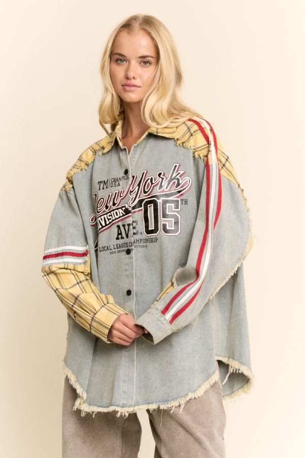 Standout denim patchwork shirt jacket blending varsity spirit with streetwear edge. Designed with contrast plaid sleeves, bold embroidery front and back, and athletic stripe detailing for a retro-sport look. Oversized silhouette layers easily over tees or knits, making it the perfect statement piece for boutique buyers seeking unique casualwear with character.