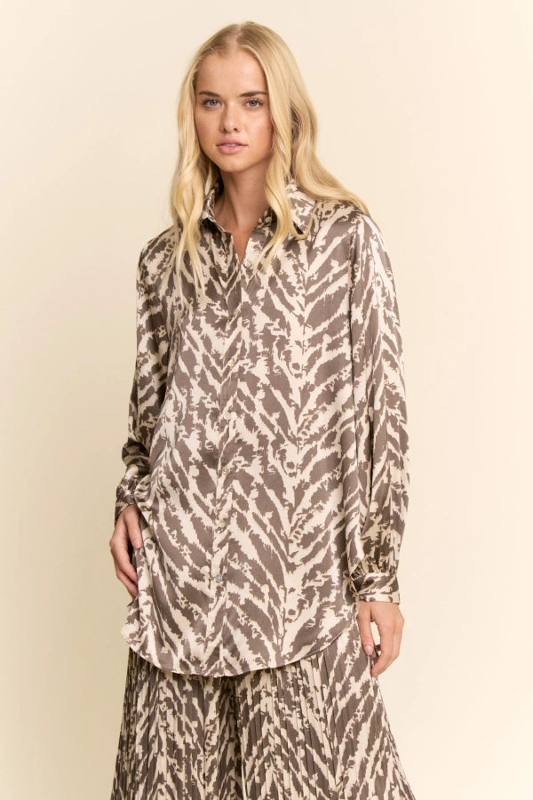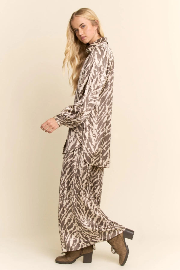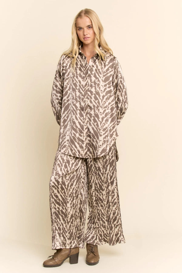 This bold two-piece set pairs a relaxed button-front shirt with wide-leg pleated pants in a striking animal print. Designed for effortless wear, the fluid silhouette offers comfort with a statement edge. Perfect for boutique collections that value versatile separates styled together or apart, delivering standout looks for day-to-night dressing.