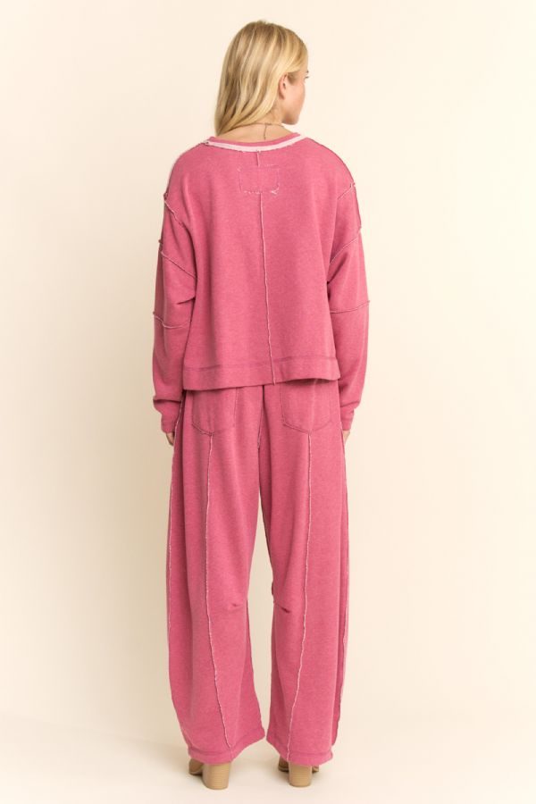 A modern update to loungewear, this two-piece set features a relaxed drop-shoulder top and wide-leg pants with drawstring waist and oversized patch pockets. Contrast raw-edge seams add an effortless, lived-in look, while the soft knit fabric keeps it comfortable yet elevated. A versatile boutique staple, perfect for casual days, travel, or laid-back weekends that call for style and ease.