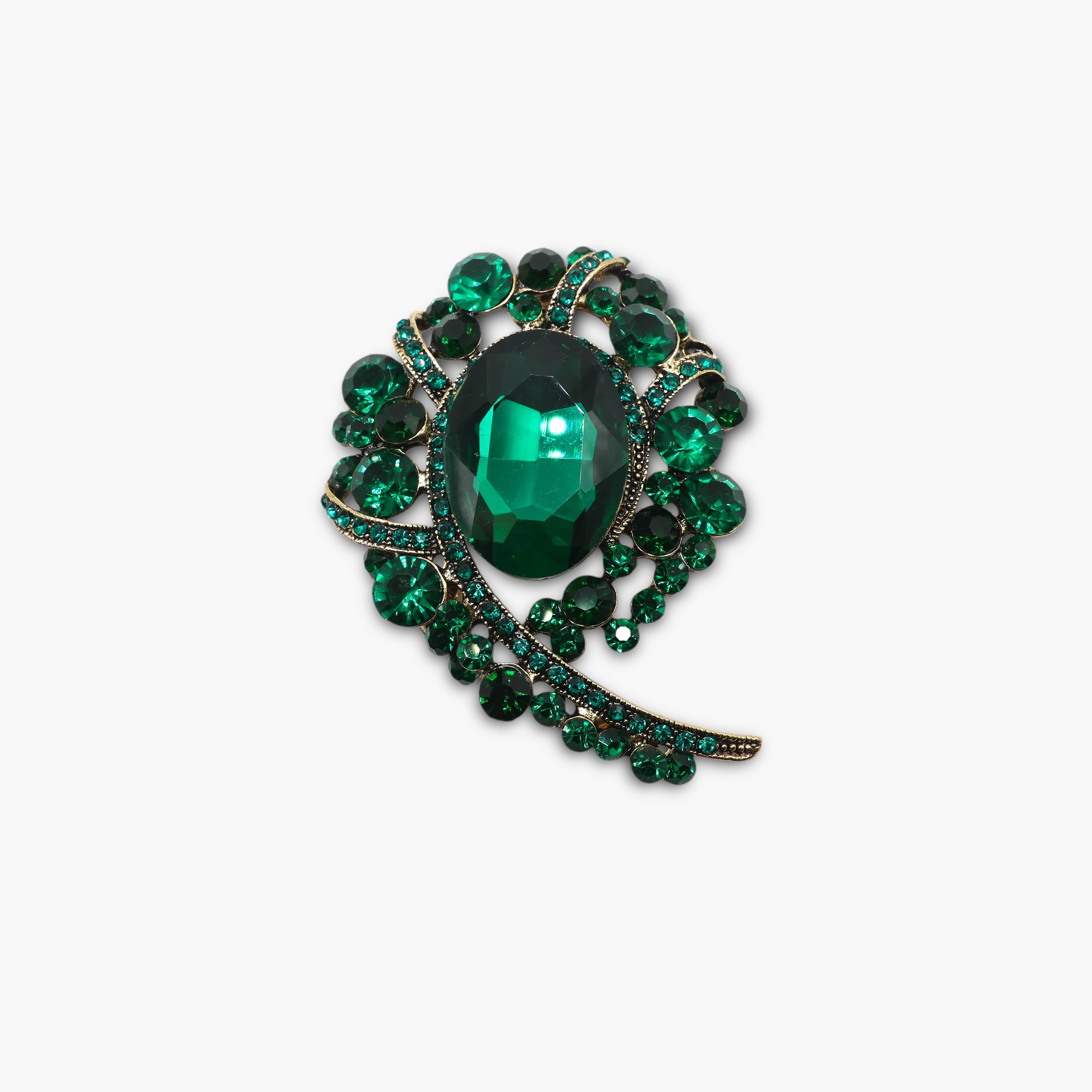 An elegant brooch featuring a large faceted stone surrounded by a swirl of smaller sparkling accents. This ornate, vintage-inspired design adds a touch of sophistication and brilliance to jackets, scarves, bags, or formal ensembles.