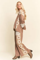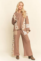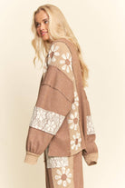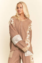 A textured knit top enriched with floral lace applique panels and contrast flower motifs. This boutique-worthy design blends cozy comfort with artisan detail, offering a relaxed silhouette that layers with ease. Its unique mix of textures makes it versatile for casual styling or curated displays, appealing to buyers seeking elevated, wearable pieces that stand out for their charm and craftsmanship.