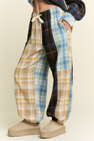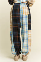 WOMEN'S MULTI COLOR PLAID PATTERN JOGGERS. ELASTIC WAIST BAND WITH DRAWSTING. BACK POCKET DETAIL.