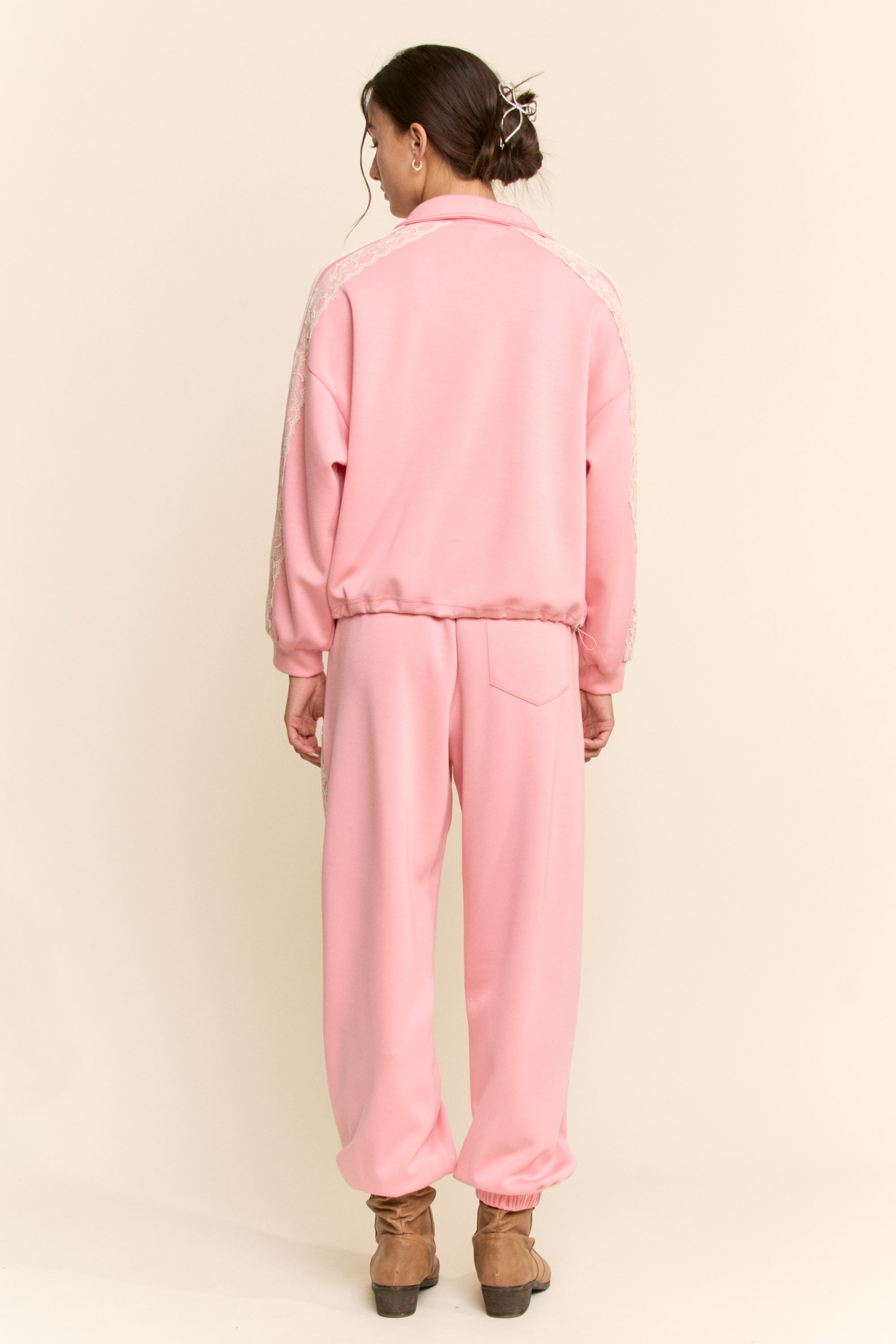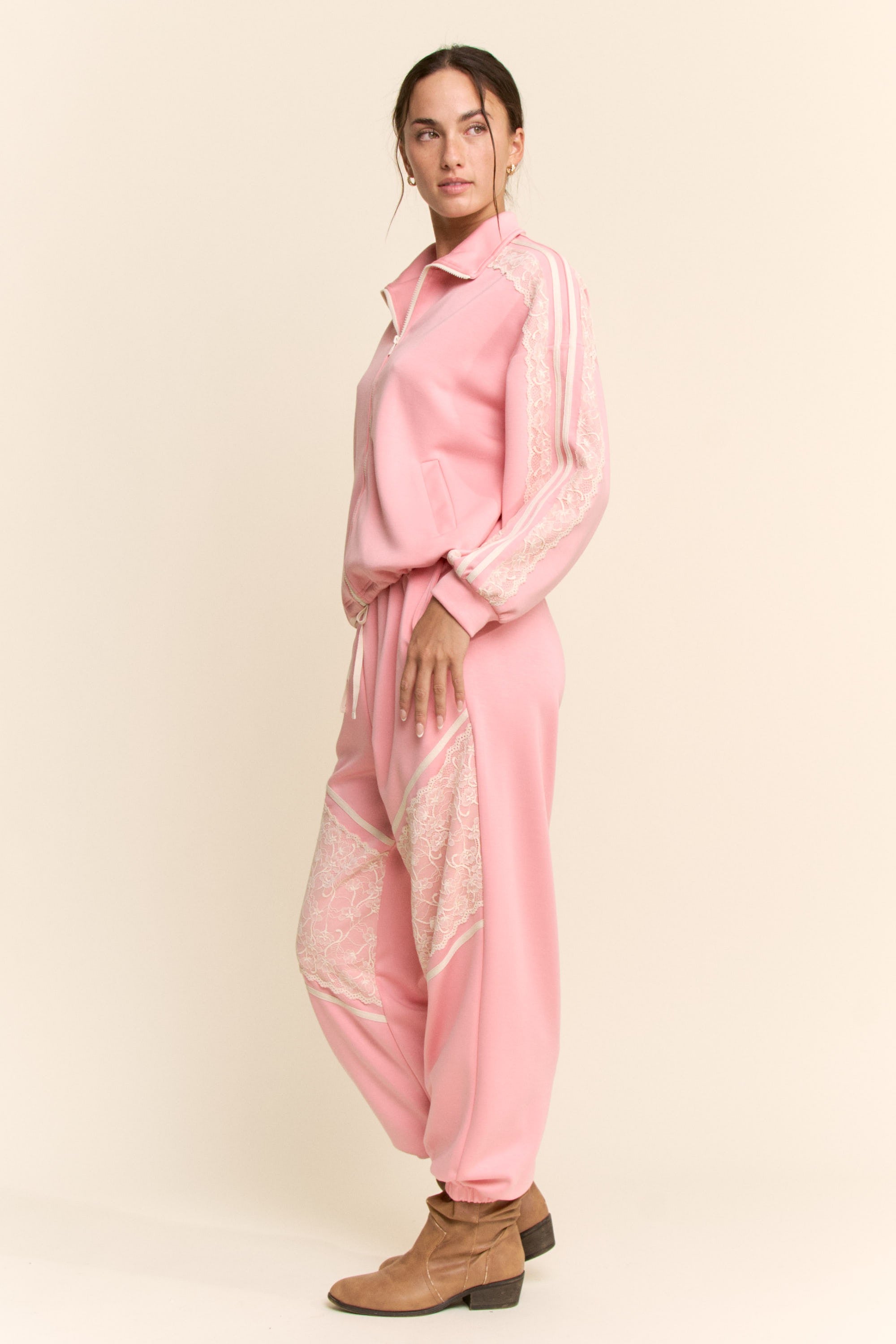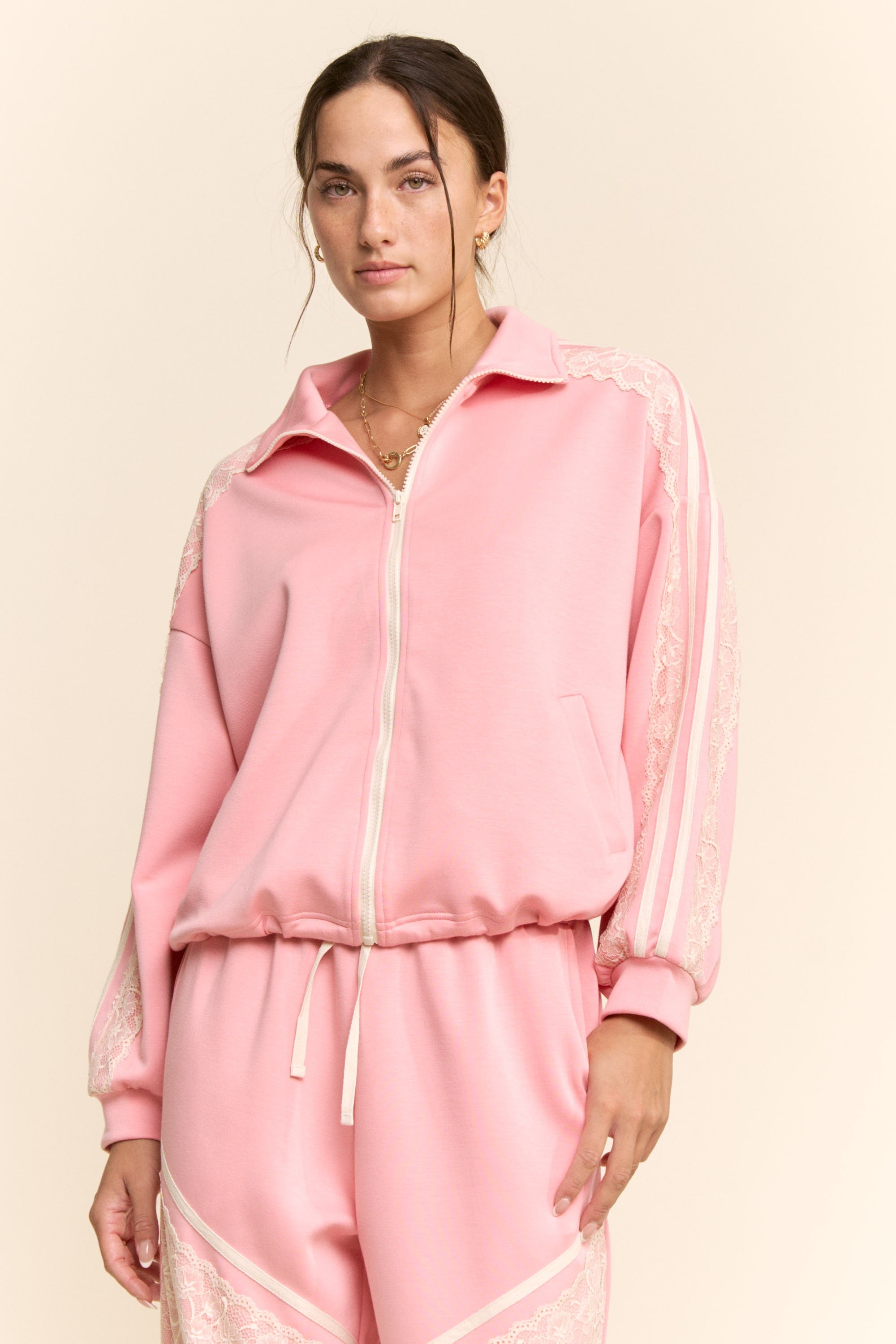 A stylish zip-up jacket that blends sporty comfort with feminine detailing. Designed with a relaxed fit, elastic hem, and soft fabric, it features delicate lace panel accents for a unique athleisure look. Perfect for casual wear, layering, or coordinated sets.