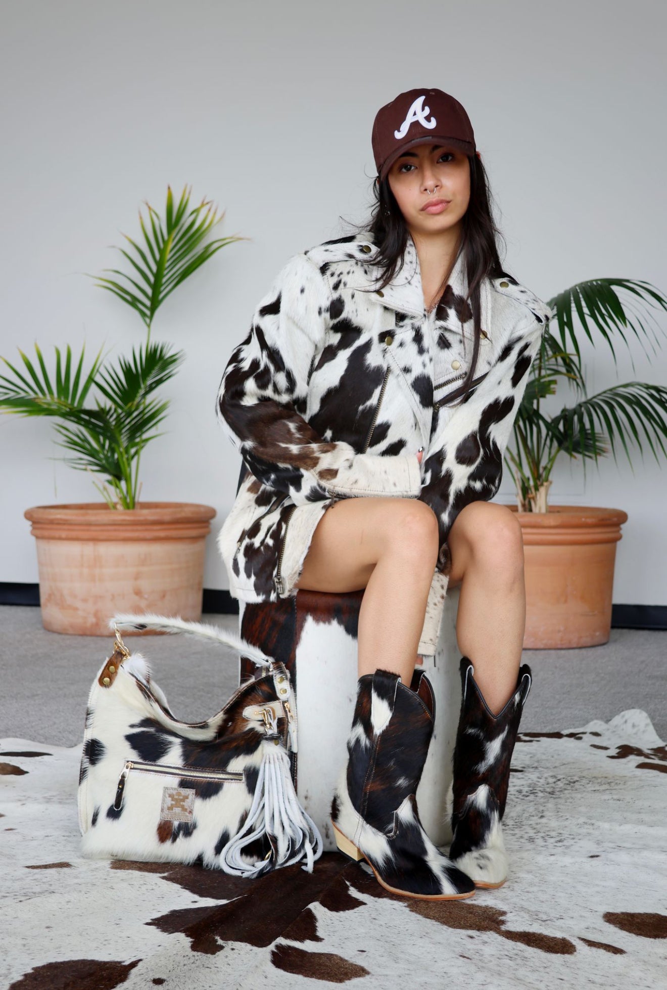- A striking western-inspired look featuring a cowhide-style jacket paired with matching boots and accessories. This bold ensemble blends modern street style with classic western elements, creating a standout statement outfit perfect for confident, fashion-forward styling.