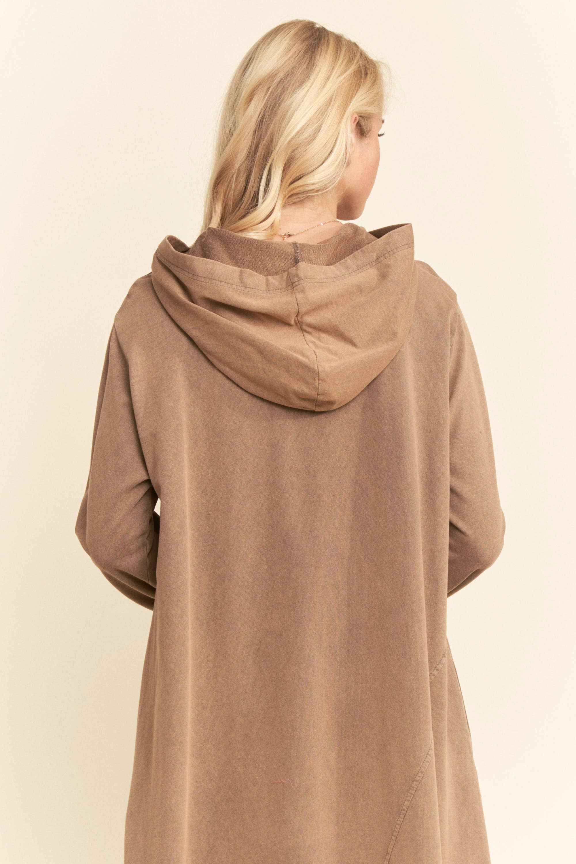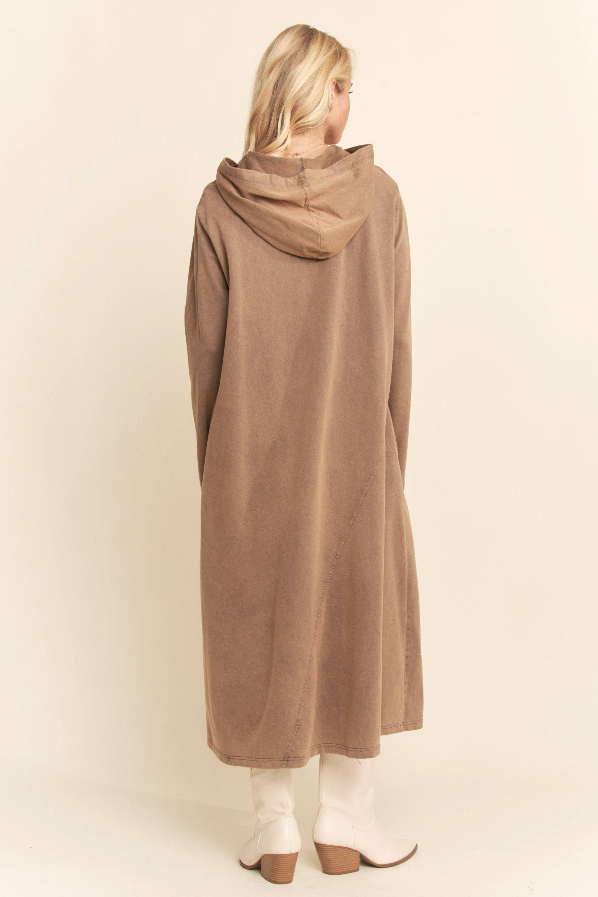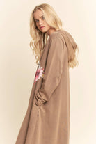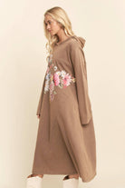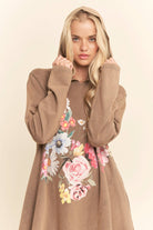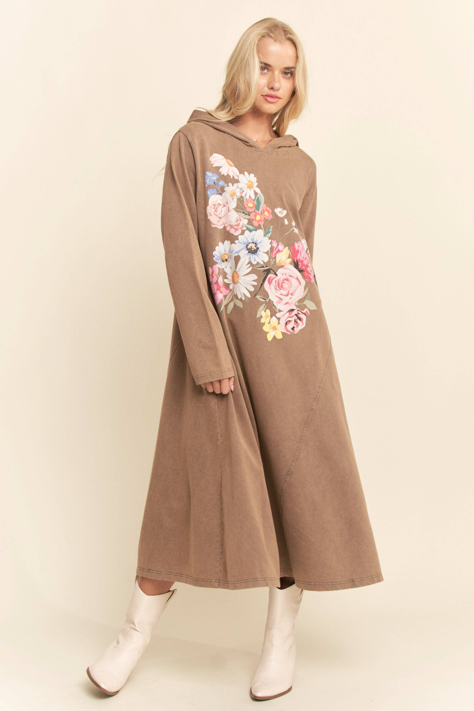 Elevate everyday wear with this floral print hooded midi dress, designed in soft washed fabric for a relaxed, draped silhouette. Featuring side pockets, long sleeves, and a painterly bouquet motif across the bodice, it blends casual ease with feminine detail. A versatile piece for boutiques, perfect for layering through seasons while offering comfort and charm in one statement-making dress.
