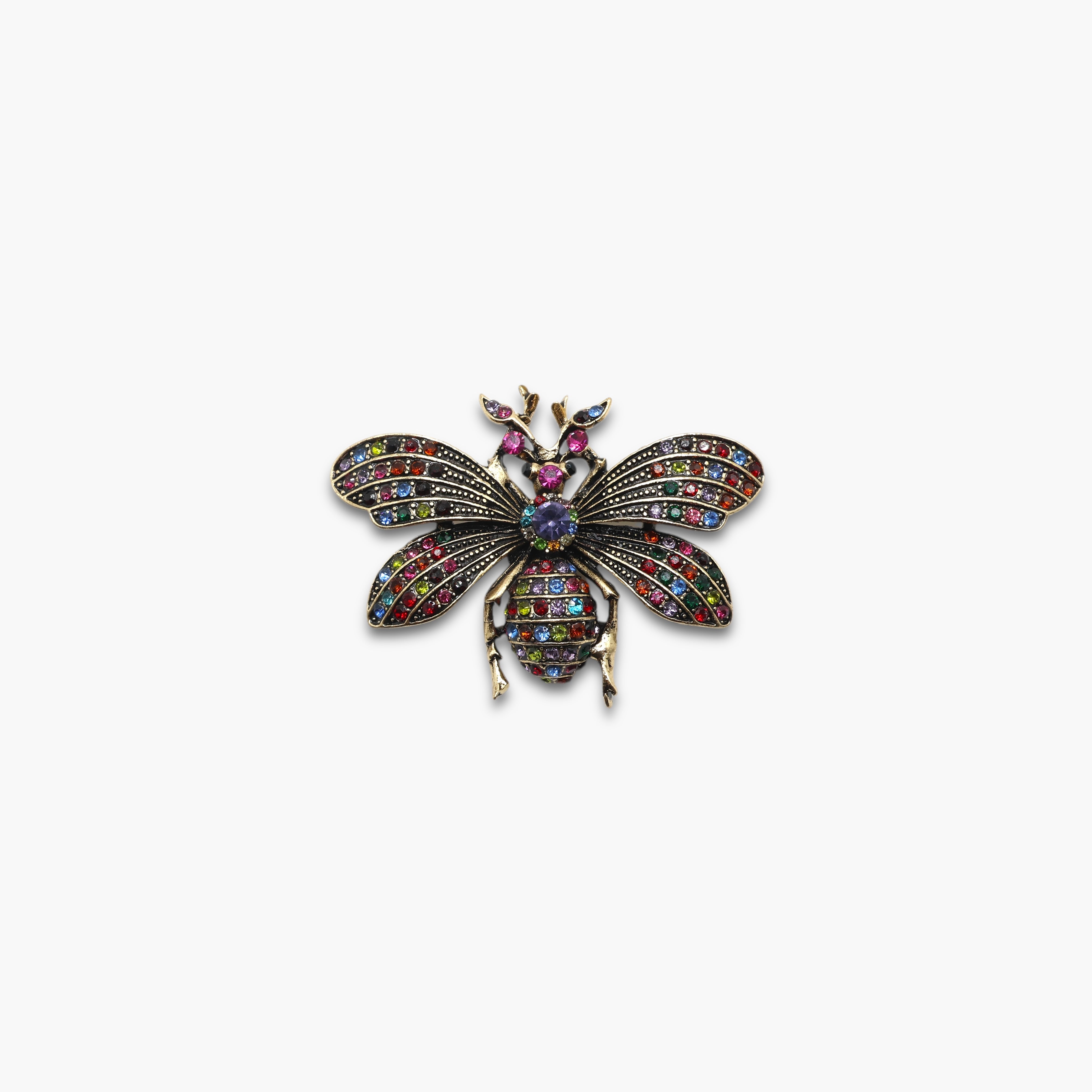 A striking insect-inspired brooch adorned with sparkling crystals across its wings and body. Designed with intricate detailing and a bold, artistic silhouette, it adds a vibrant statement touch to jackets, scarves, or bags.