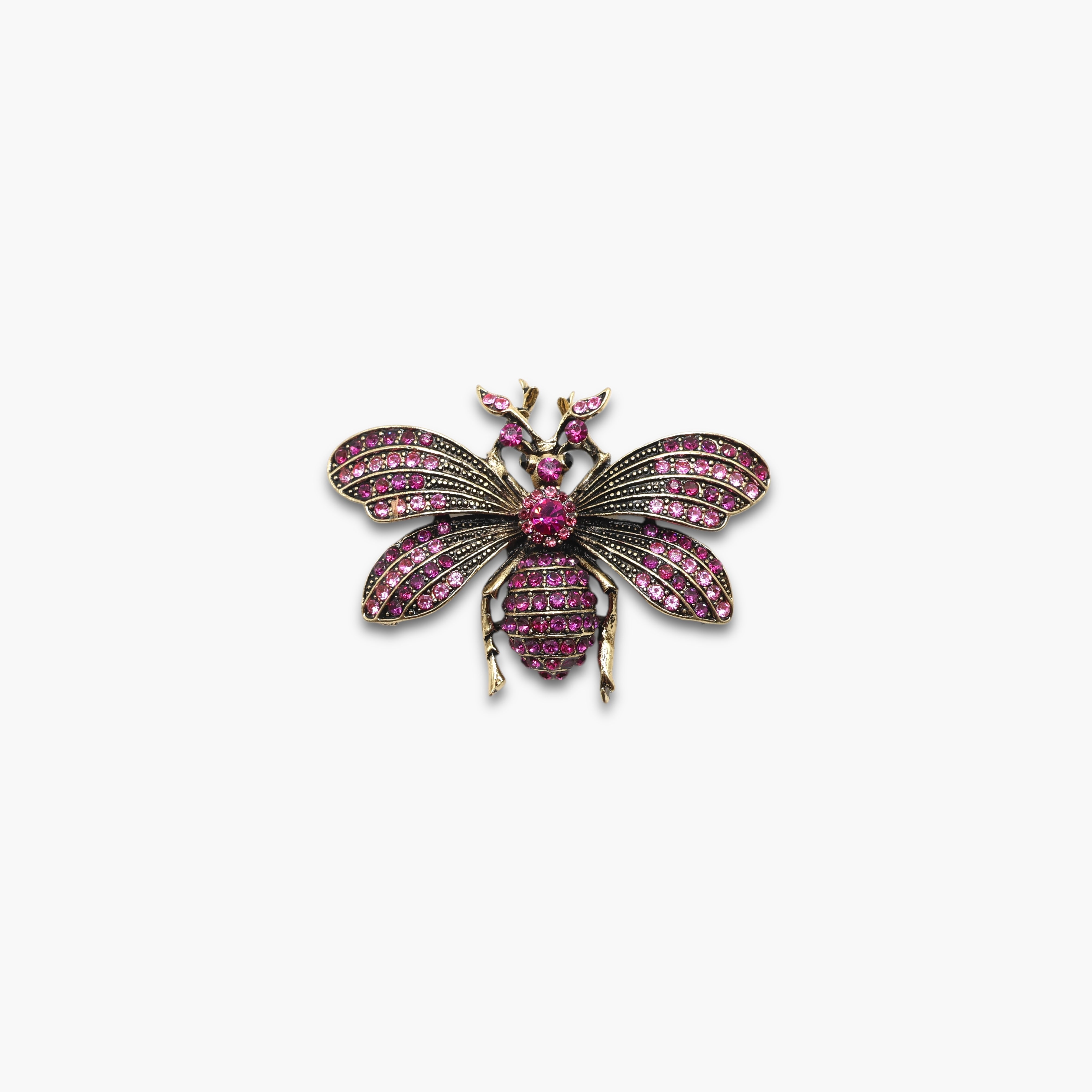 A striking insect-inspired brooch adorned with sparkling crystals across its wings and body. Designed with intricate detailing and a bold, artistic silhouette, it adds a vibrant statement touch to jackets, scarves, or bags.