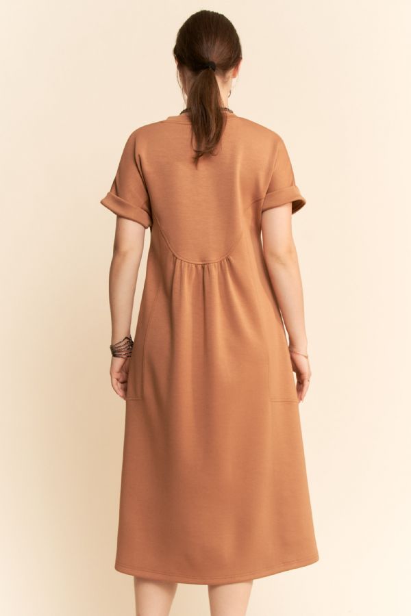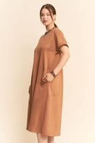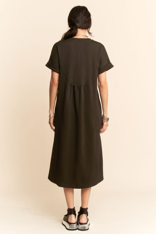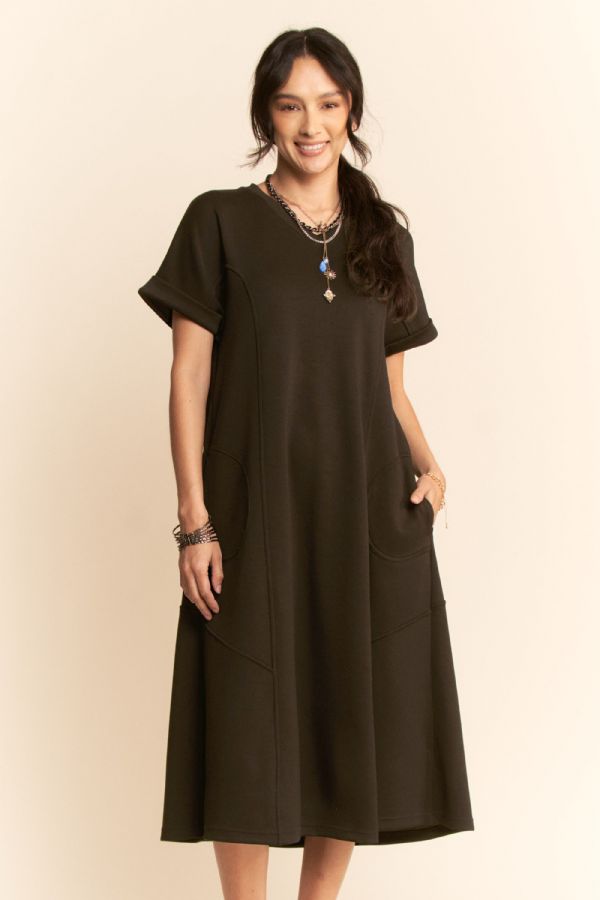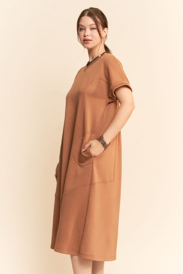 SOFT KNIT V NECK SHORT SLEEVE SHIFT MIDI DRESS