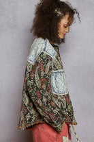 Designed in balloon sleeve relaxed fit shaket top in jacquard with denim quilting patch, outseam, front pocket with shirring, raw edge, back heart patch, vintage washing, floral pattern.