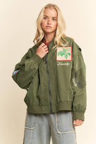 Western-inspired bomber jacket with bold cowboy embroidery and "West Coast Rodeo" lettering. Lightweight nylon shell with ribbed cuffs and hem, zip front, side pockets, and sleeve pocket. Available in Olive Green and Black. Perfect statement piece for boutiques, festival fashion, and streetwear collections.